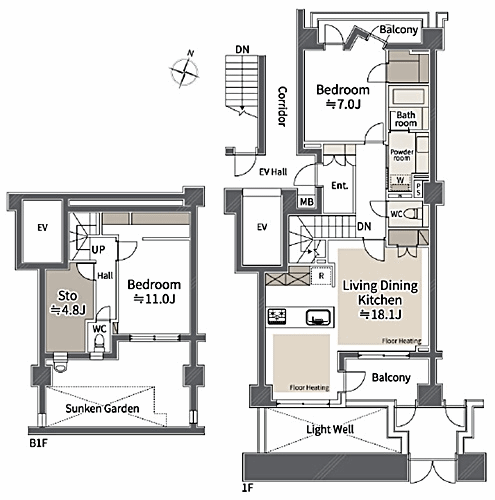 TVモニター付オートロック、エレバーター、宅配ロッカー、サンクンガーデン、スロップシンク、サービスルーム(4.8帖)、ウォークインクローゼット、フローリング、トイレ2ヶ所、床暖房、2面バルコニー、メゾネットタイプ
