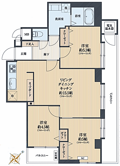 モニター付インターホン、エレベーター、浄水機能付、洗面化粧台、追い焚き機能付、浴室乾燥、温水洗浄便座、エアコン、フローリング、2面バルコニー