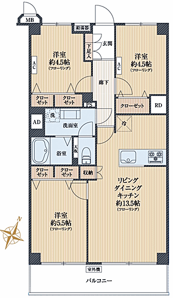 エレベーター、モニター付インターホン、食器洗浄機、浄水機能付、洗面化粧台、追い焚き機能付、浴室乾燥、温水洗浄便座、エアコン、フローリング、2023年11月大規模修繕工事済